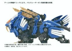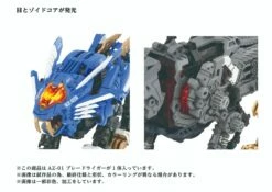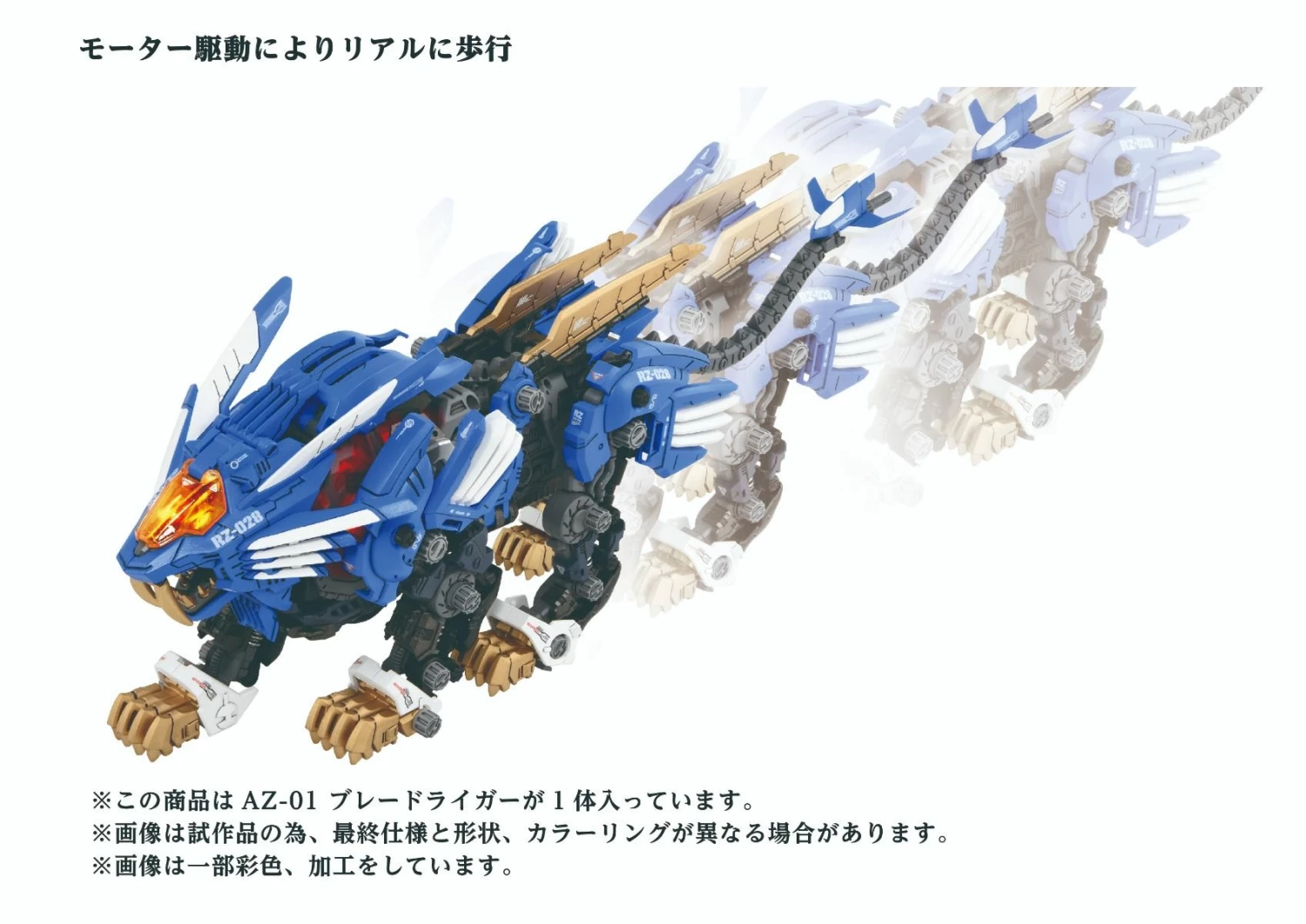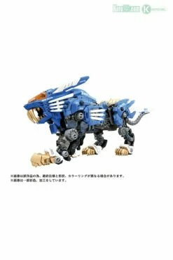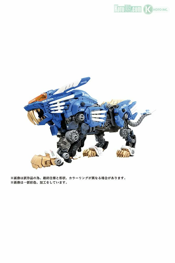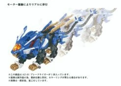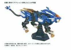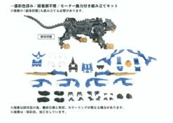A buildable, motorized Zoid Liger kit with LED lights (batteries not included) and display stand.