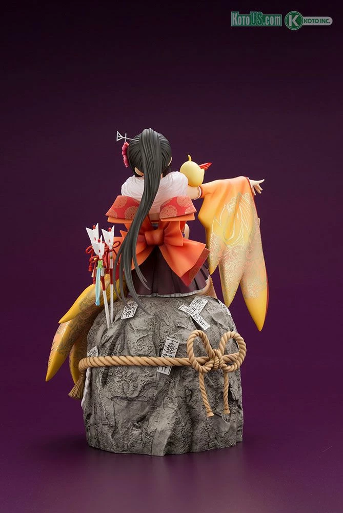 The slender hands holding the “ema” (votive picture tablet) are sculpted at a perfect angle to create a graceful appearance.The hair ornaments and the arrows used to drive off evil are also reproduced in great detail. The gold coloring used for the base yellow theme of the kimono coupled with vivid red highlights creates a beautiful finish on this statue.The talismans on the giant boulder can be affixed wherever the user would like. Be sure to get your hands on this item in order to enjoy this statue from 360-degree view.