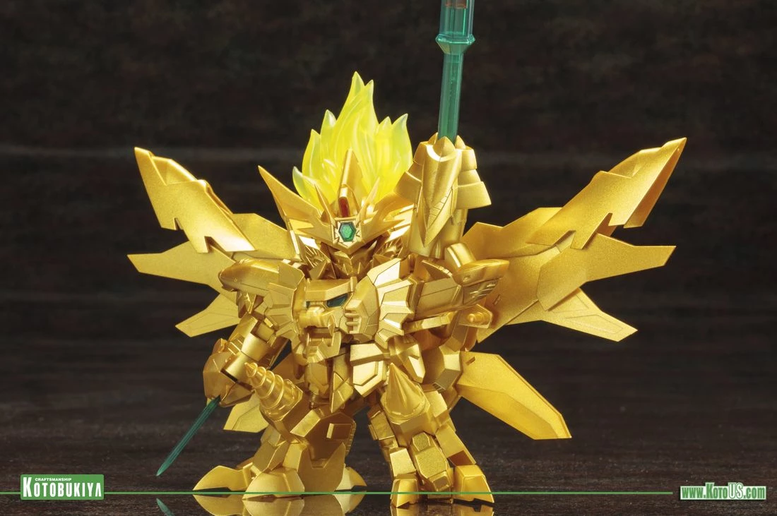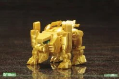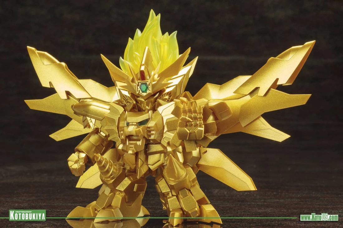 A KOTOBUKIYA Japanese import! “D-Style” is Kotobukiya’s plastic model kit series featuring various mecha rearranged into stylized miniature versions allowing you to collect your favorite robots in a high quality compact scale with solid construction and an unbeatable price. Up next in the fun series from Brave King Gao Gai Gar in the deformed style is the ultimate solid color final version of Genesic GaiGar and the five Genesic Machines (ProtectGao, SpiralGao, BrokenGao, StraightGao, & GadgetGao), GENESIC GAO GAI GAR THE GOLDEN DESTROYER! The set includes all six elements in brilliant gold which you can combine into the ultimate version like in the anime. A complex and powerful robot, the little mecha features a cool lion head on its chest, drills on its knees, flaming energy “hair,” and much more. Standing just under 4 ½ inches tall in its assembled form, Genesic Gao Gai Gar The Golden Destroyer is comprised of 200 pieces molded in pre-colored plastic (gold with green, yellow, and red details), so no painting is required and assembly is a snap! Multiple points of articulation along with interchangeable parts and weapons (like launching fists and claws) provide for a huge range of posing options for the robot. The Golden Destroyer is the perfect new addition to your Gao Gai Gar D-style plastic model kits from Kotobukiya!