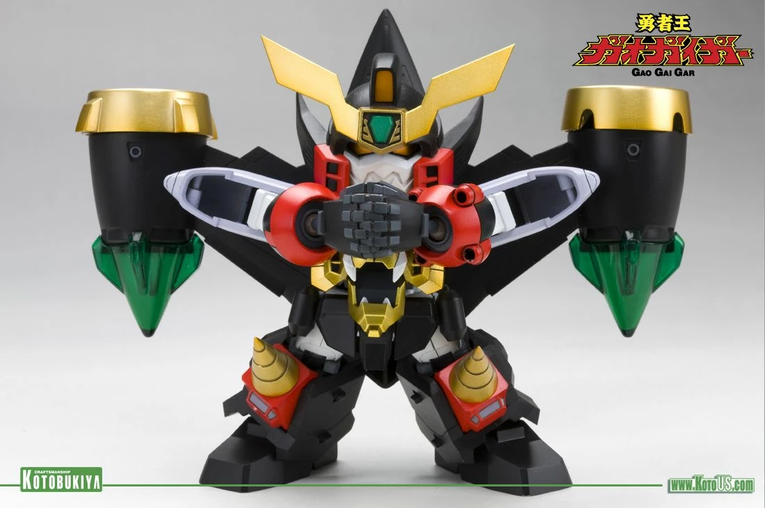 A KOTOBUKIYA Japanese import! “D-Style” is Kotobukiya’s plastic model kit series featuring various mecha rearranged into stylized miniature versions allowing you to collect your favorite robots in a high quality compact scale with solid construction and an unbeatable price. Joining the first two robots from Brave King Gao Gai Gar in the deformed style is another pair of cool mechanical units starting with STAR GAO GAI GAR! Consisting of 130 parts, this kit incorporates the previous Gao Gai Gar D-Style model along with the new Goldymarg and Stealth Gao II parts to form the upgraded Star version. It even includes interchangeable hand parts to recreate the Dividing Driver and Hell and Heaven attacks from the anime! Fully pre-painted from the gold, red, and black of Gao Gai Gar to the green details of Stealth Gao II, the Star robot is easy to assemble and has many pieces that can be combined in different ways so you can create the pose you prefer. Standing 5 inches tall, Star Gao Gai Gar is the perfect robot to keep your display shelves safe from invading Zondarians!