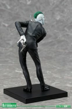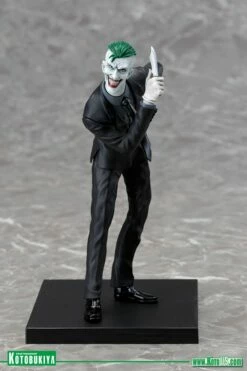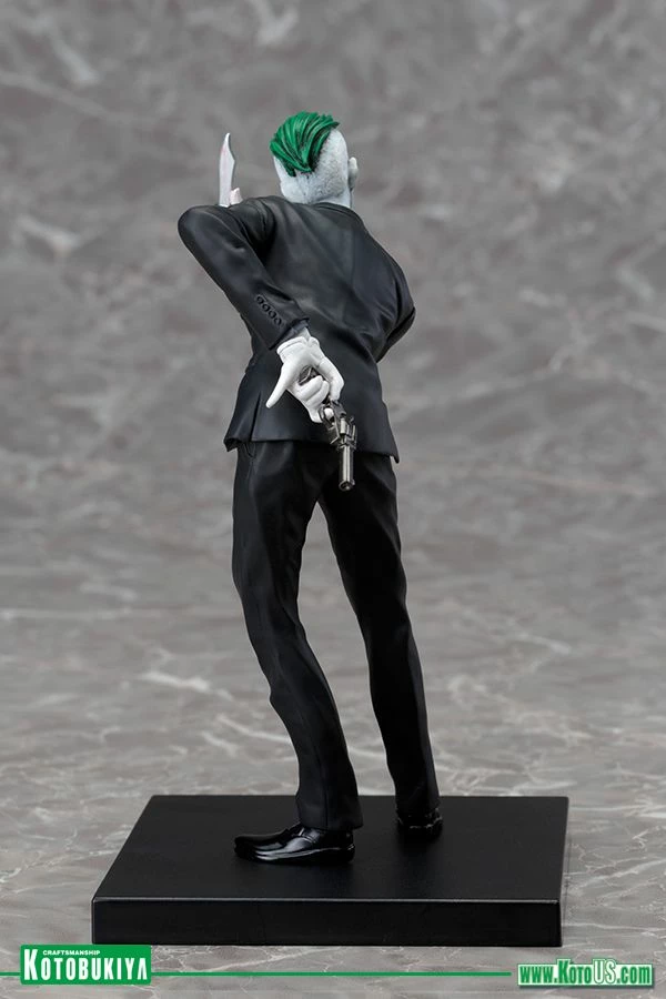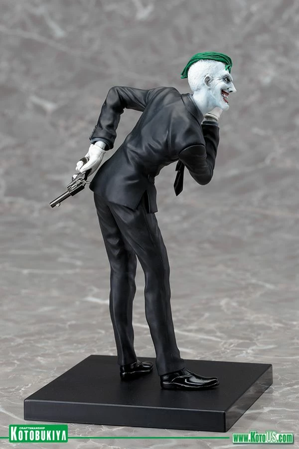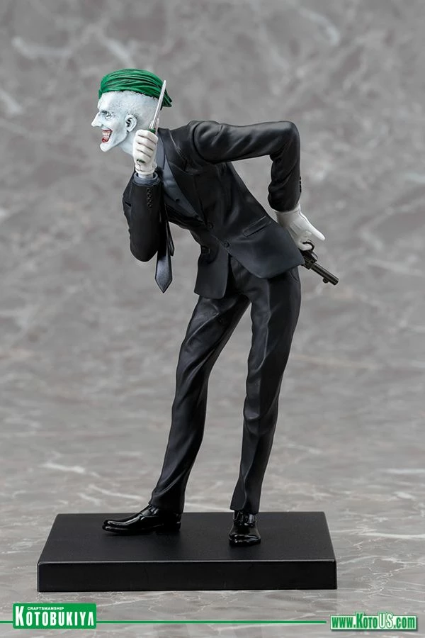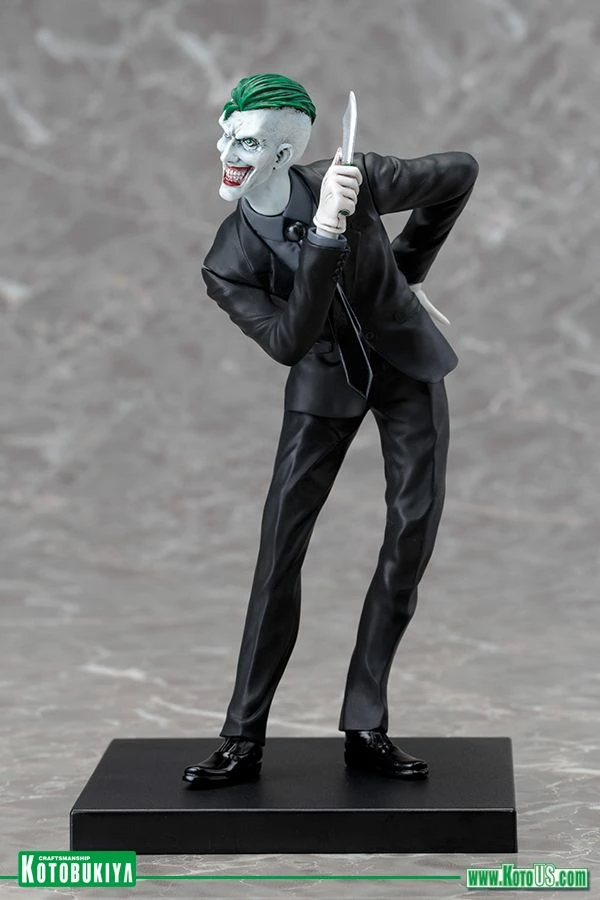 Kotobukiya’s lineup of statues based on the superheroes and villains of DC Comics continues to grow with the addition of one of the greatest comic book villains ever, the JOKER! Capturing the character’s iconic look from the New 52, Joker arrives to torment the previously released series of “Batman Family” heroes like Batman, Batgirl, Nightwing, Robin, and Red Hood. The Caped Crusader’s archenemy first appeared in comics way back in 1940 and got a very interesting update in the New 52 with a startling appearance and wicked plans for Batman and his allies. Now the Joker is back and more evil than ever in this highly detailed 1/10 scale statue! There’s no mistaking the gleeful insanity of the Joker and he shows it off as he leans forward, taunting the Batman with weapons in hand. The psychotic villain wears a snappy black suit with shiny black shoes, a dark gray shirt, black tie, and white gloves. His clothing shifts and creases in his exaggerated pose revealing a slim build and gangly limbs. Joker’s bleached white head is accented by his shockingly green hair and the horrific grin on his face with its beady eyes and mouthful of teeth. The Clown Prince of Crime brandishes a knife in front of him while hiding a pistol behind him. Joker stands just over 7 inches tall (1/10 scale) and like all ARTFX+ statues he has magnets in his feet for extra stability on his included display base. Bring this New 52 villain home for some crazy antics and the perfect contrast to your Batman Family ARTFX+ Statues!