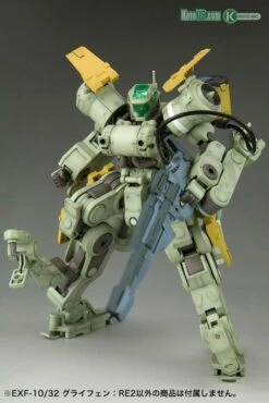 This model is composed of completely new parts based on an illustration by Tomotake Kinoshita. The arms and legs are equipped with hidden sub-arms to serve various purposes. The included weapons can be held in the model’s hands or attached to various points on the model’s body using the attachment parts. As a novel addition to the Frame Arms line, Greifen is not only fun to assemble, but also brings tons of new possibilities for customization.