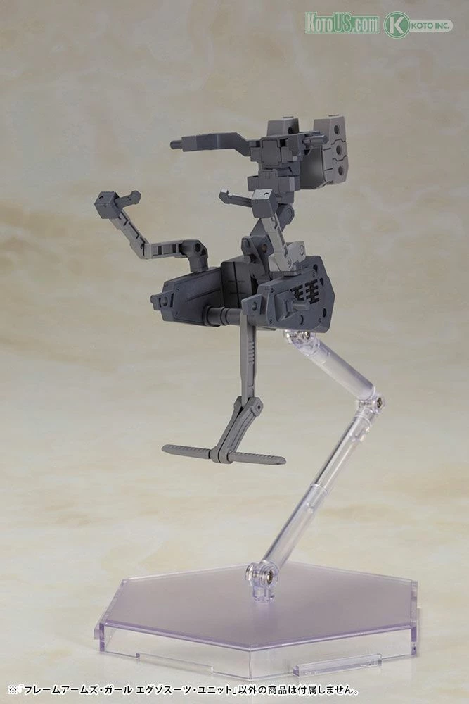 The Exosuit Unit consists of connection points to attach a Frame Arms unit’s arms and legs, a waist mount and back arm for a Frame Arms Girl to