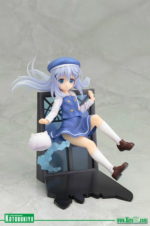 A KOTOBUKIYA Japanese import! The next fun property joining Kotobukiya’s incredible Ani*Statue lineup is the comedy manga turned anime series Is the Order a Rabbit? In Rabbit the new girl in town goes to live in the Rabbit House café and meets the interesting characters there. The main character of the story is the first girl to be immortalized in Ani*Statue form: CHINO KAFU! Her name inspired by the word “cappuccino,” Chino appears here in a humorous and whimsical pose appearing to float in mid-air. The girl wears a cute outfit with a blue and white color scheme consisting of a skirt, jacket with values and thick lapel, long shirt, high socks, and an adorable puffy hat. Chino hovers above her base, leaning back with her limbs outstretched, her hair flying around her, and a surprised look on her face. Alongside her flies Tippy, the girl’s dead grandfather trapped in a fluffy white rabbit’s body! Sculpted with fantastic detail by Takanari, Chino is nearly 6 inches tall (1/8 scale) as she floats above her specially designed display base. Get the cute girl and her grandfather/rabbit before they drift away!