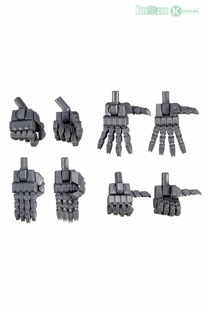 [Weapon Holding Hands 2]The hands hold weapons at a shallow angle. These are perfect for blade weapons, such as swords and spears, and can accommodate poses with the weapon facing forwards. Swapping out the swing joint also allows for two different angles of movement. [Open Hands 2]These are new hands with the fingers spread wide open.While the hands can be used as is, the swing joint allows for more dynamic posing, such as slapping and landing. [Open Hands 3 (Spear Hands)]New to the Wild Hand units, this open hand shares a design with that in HAND UNIT MB41 SHARP HAND.