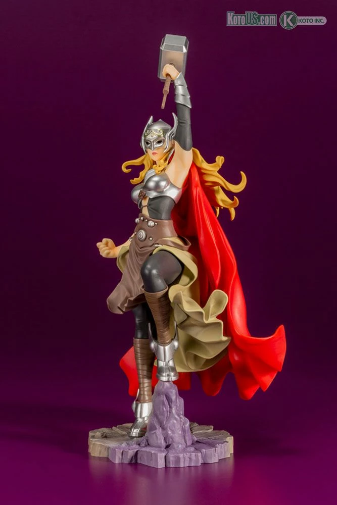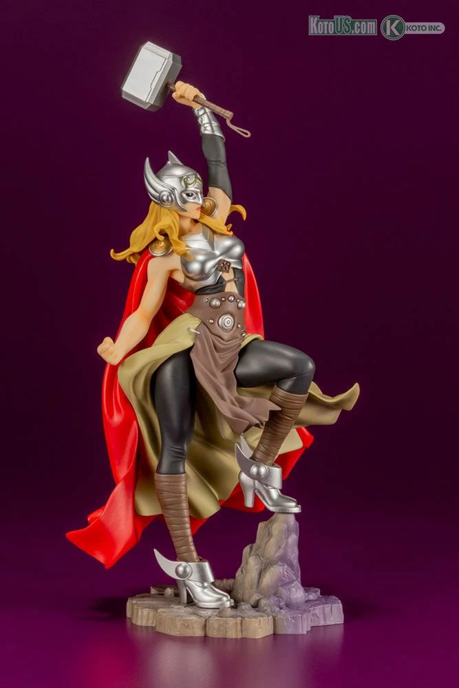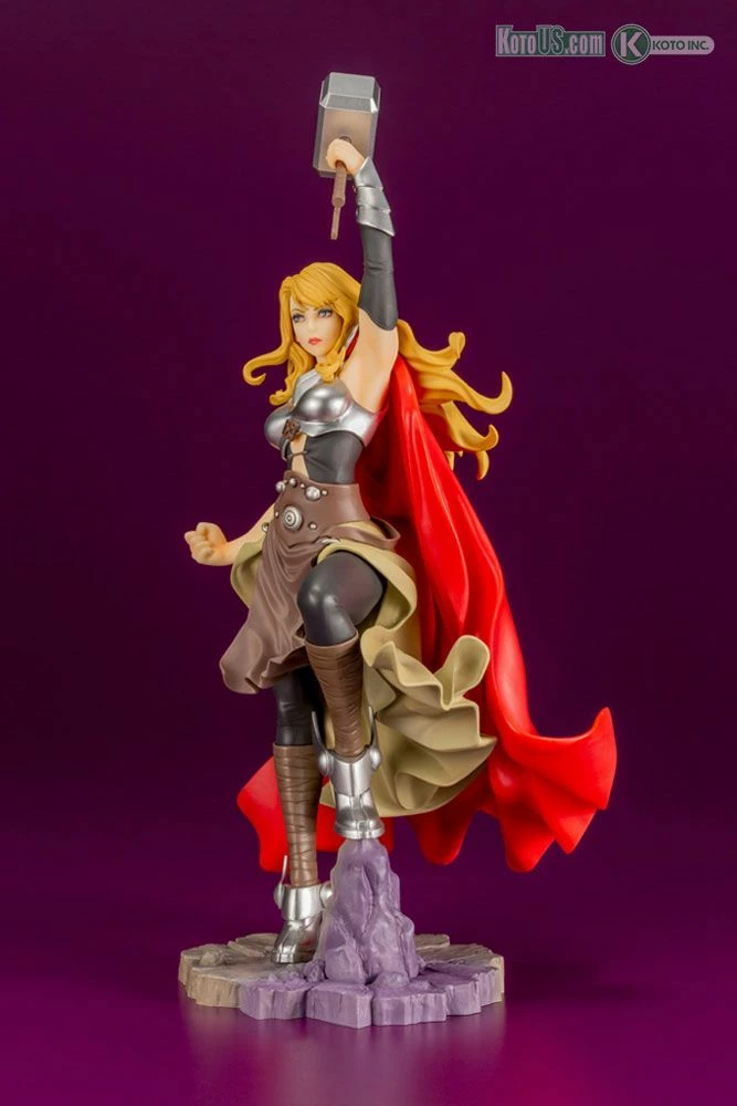 Her muscular figure strengthened by the power of Mjolnir, silver helmet and armor, and fluttering cape give the statue the elegance of a refined Asgardian.