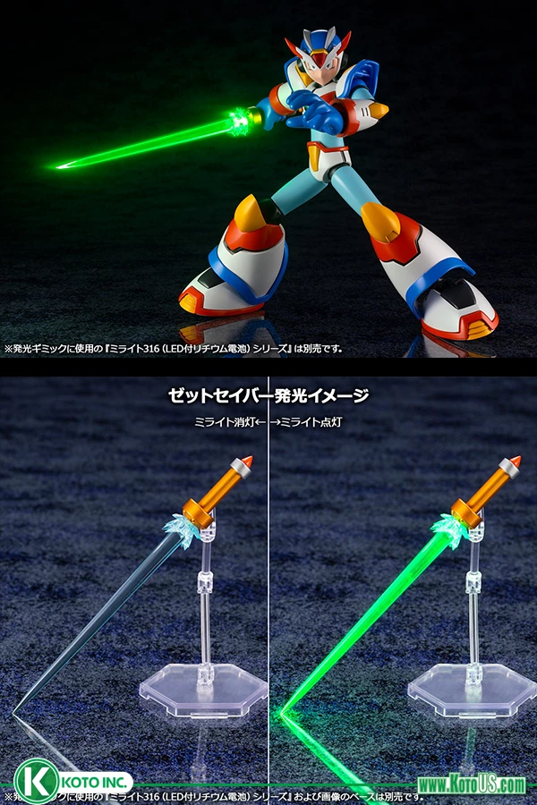 The powerful Z Saber given to X by his dear friend, Zero, is included in this kit! By adding a Milight 316 (lithium-ionbattery with an LED attached) to the Z Saber, you can make the clear blade light up!