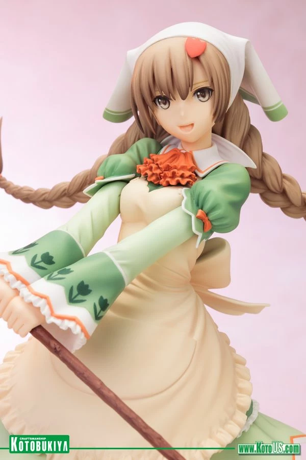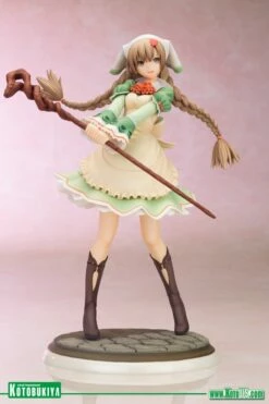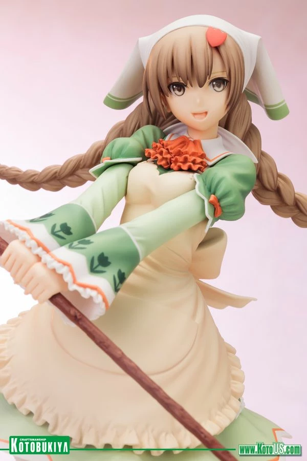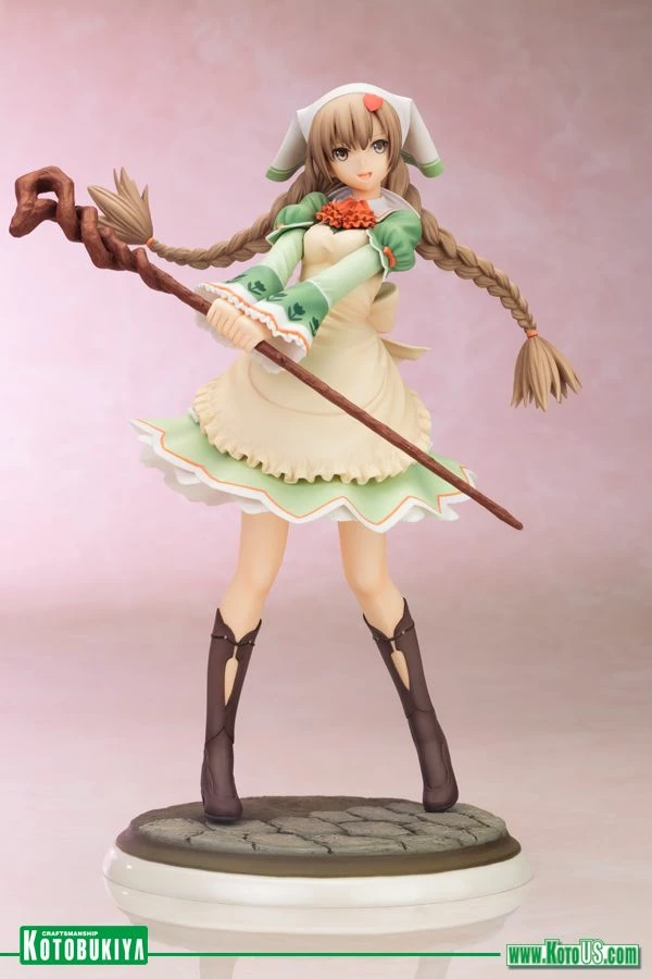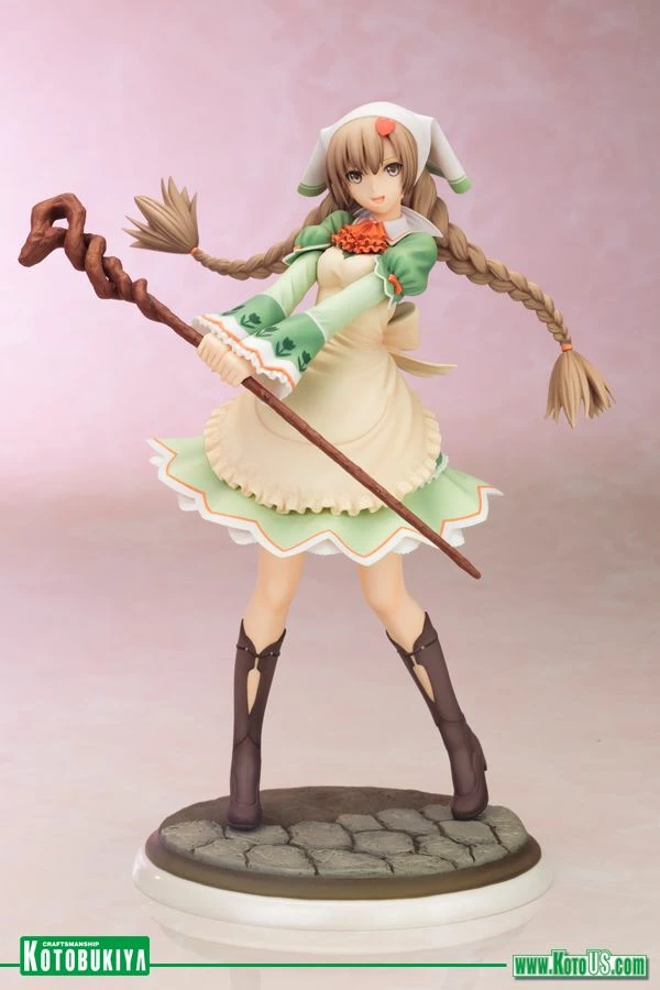 A Kotobukiya Japanese import! The lovely ladies of the “Shining” series from SEGA have made for an incredible line of Ani*Statues, and up next is the latest entry from Shining Blade with a new version of the brown haired and brown eyed baker Amil Manaflare! One of the three sisters who run the Le Couer Bakery (along with Neris and Airy), Amil wears her cute work outfit consisting of a beautiful green and white dress with multiple layers, fringes, puffy shoulders, flared cuffs, a frilly orange necktie, and more, which she protects with a tan apron that has a large bow at the back. There are all sorts of great little details on her ensemble as well like the orange bows on her sleeves and the tulip theme appearing on her cuffs and hairclip. Amil poses outside in a sweeping gesture, spinning around while holding her mighty wooden staff with both hands and letting her long, intricately sculpted braids whip behind her. Amil Manaflare stands just under 8 inches tall (1/8 scale) atop a specially designed cobblestone styled display base. Display the adorable baker alone or alongside other statues from Kotobukiya based on the characters in Sega’s Shining series of games!