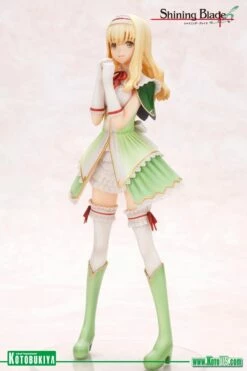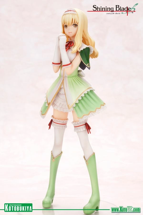 A KOTOBUKIYA Japanese import! From last year’s epic Shining Blade game (the latest in the hugely popular Shining Saga by Sega) comes ELMINA RHODERIA! One of the powerful songstresses who can create magical effects with her voice, Elmina assists Rage in his quest to defeat the Dark Dragon. Sculpted by Hitoshi Nakamura, Elmina stands in a very cute pose that belies her strength in battle. She holds her hands together in front of her smiling face that looks at you earnestly, while her feet are slightly pigeon toed. The songstress wears a fabulous green and white outfit with gold and red highlights emphasizing her royal background with layered skirts, long boots, stockings, and gloves. Her beautifully-sculpted face peeks out from under long bangs, and intricate details can be seen on the fringes, ruffles, and ribbons of her clothing. Elmina stands just over 7 ½ inches tall (1/8 scale) and looks great by herself on your shelf or as the centerpiece of your Shining series collection!
