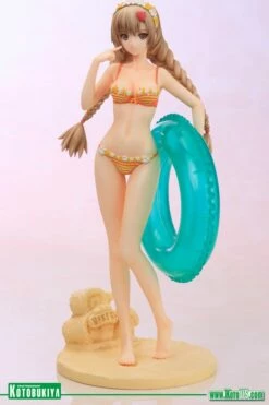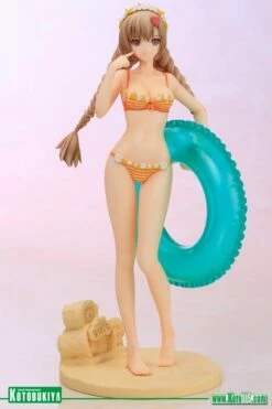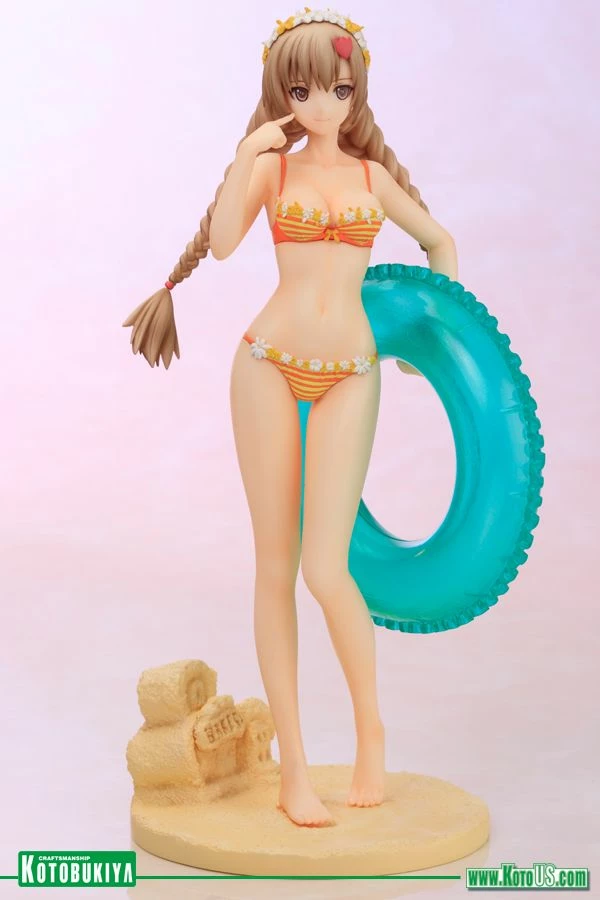 The lovely ladies of the “Shining” series from SEGA have made for an incredible line of Ani*Statues, and once again Kotobukiya returns to the highly popular Shining Hearts game for the next one. Coming up is another main protagonist of the game showing up in her swimming attire, AMIL MANAFLARE SWIMSUIT VER! Another of the three sisters who run the Le Couer Bakery (along with Neris and Airy), Amil enjoys her day off work with a trip to the beach. Looking for fun in the sun with her translucent blue inner tube, the baker wears an adorable orange and yellow striped bikini that’s accented with frilly borders and tiny bows. At the top of Amil’s head is a flowery band that matches her swimsuit, and more cute adornments help keep her impressive twin braids in check. Manaflare steps across the hot sand in an innocent pose with one knee in front of the other, and with her free hand she points to her face and the heart-melting smile there. You can even display the heroine with or without her removable green skirt! Sculpted by M.I.C., Amil Manaflare stands over 8 ½ inches tall (1/7 scale) on a special sandy terrain display base complete with “Bakery” sand sculpture. Pair up the sisters with the previously released Neris Swimsuit Ver or display Amil along with any of the great Shining Ani*Statues from Kotobukiya!