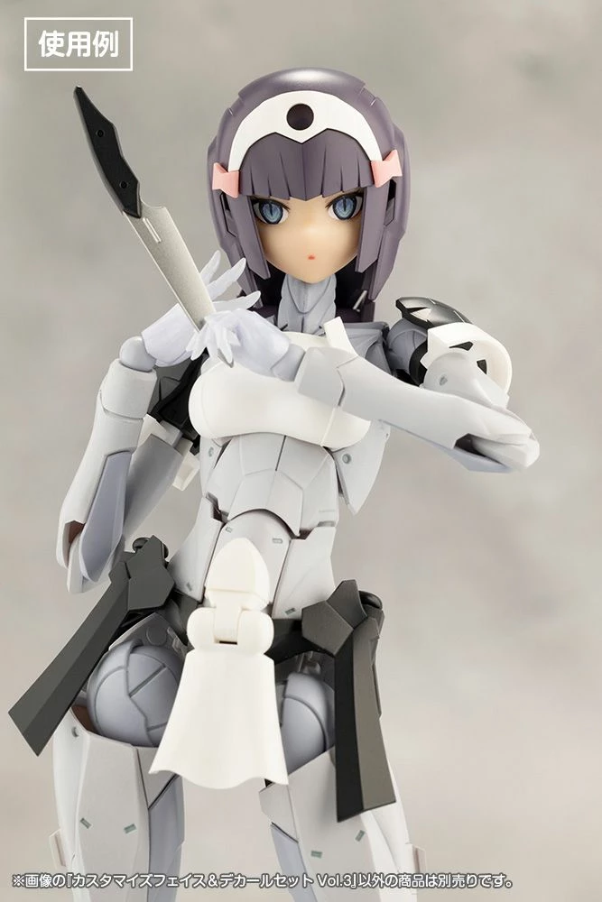 “This is a whole set of unpainted face parts and newly designed expression decals for customizing SOUSAI SHOJO TEIEN and Megalomaria models. The included face parts are compatible with SOUSAI SHOJO TEIEN face parts and Megalomaria masks, and can be used to create original face parts for both series. In addition to there being four types of expressions, they each have versions facing forward, right, and left, and all of them come in pairs. The theme for Vol. 1 through 3 is “”intense expressions for battle scenes.””