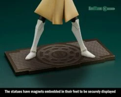 The statues have magnets embedded in their feet to be securely displayed on the included metal bases.