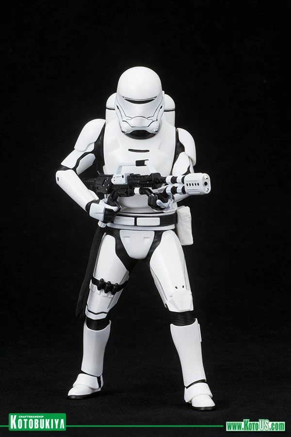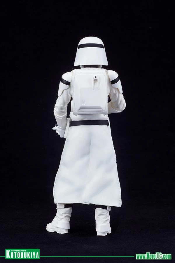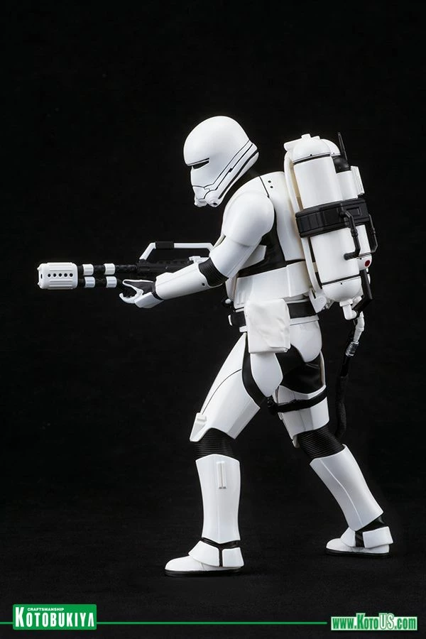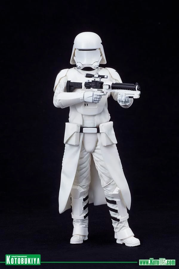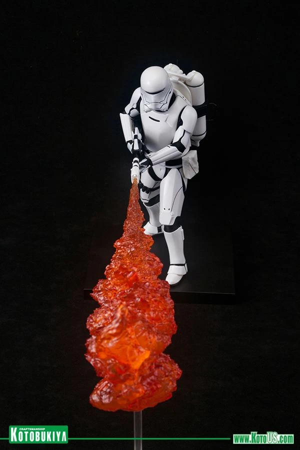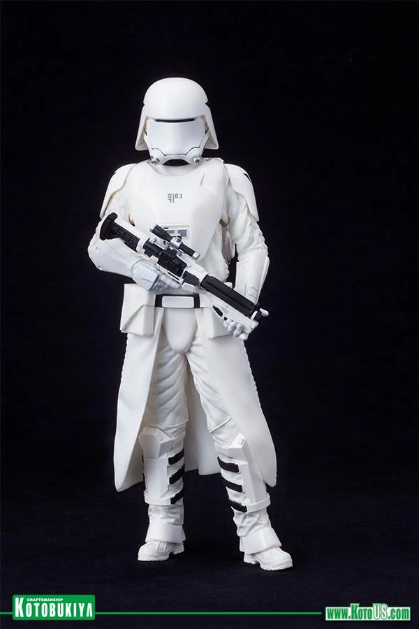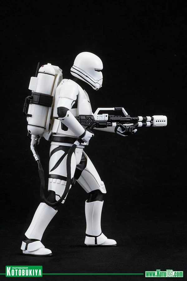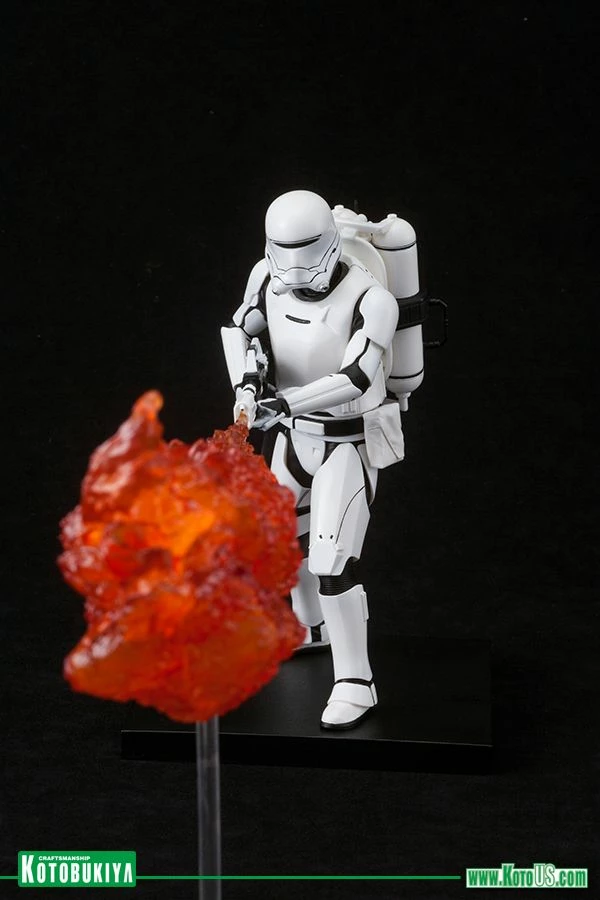 KOTOBUKIYA Japanese import! Star Wars ARTFX+ Statues bring you all of the quality and detailing that you expect from an ARTFX release in a great smaller scale perfect for collecting.The next elite army builder pack brings you more faceless characters from Star Wars Episode VII: The Force Awakens with the FIRST ORDER SNOWTROOPER & FLAMETROOPER TWO PACK! The war machine of the Imperial successor known as the First Order has several specialized stormtrooper variants, and these are two of the coolest and most popular with the fans. First up is the Snowtrooper with reinforced armor featuring thick gloves, bodysuit, kama, environmental backpack unit, and of course a distinctive helmet with glare-reducing eye slit. This Snowtrooper can be posed aiming his blaster or holding it at rest, and he comes with an optional red shoulder pauldron to denote rank. At the cold weather trooper’s side in this two pack is the Flametrooper, a highly trained soldier wielding a fearsome anti-personnel weapon. Like his Snowtrooper ally this First Order warrior wears armor with enhanced environmental features including another helmet designed to mitigate glare (this time from sheets of flame), but trades in the blaster for a powerful D-93 incinerator weapon tied to a backpack loaded with propellant tanks. Kotobukiya even supplies your Flametrooper with a special freestanding flame jet special effect part for a dynamic action display!