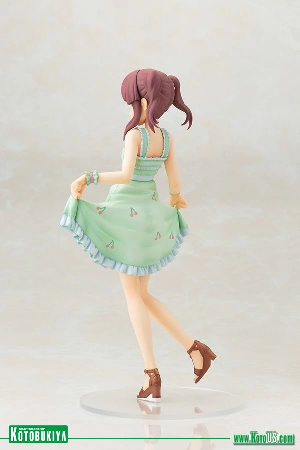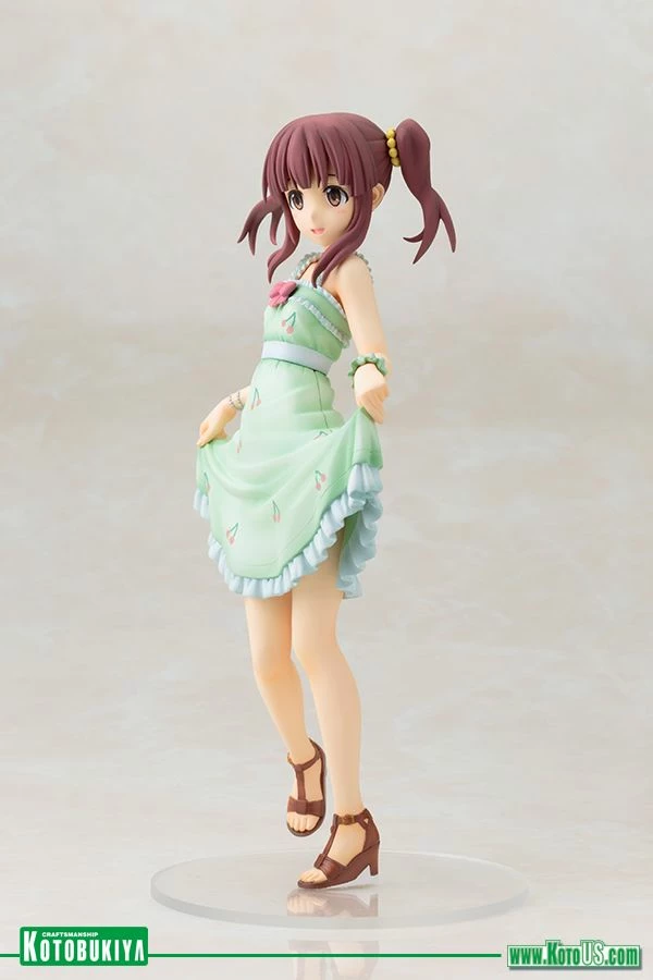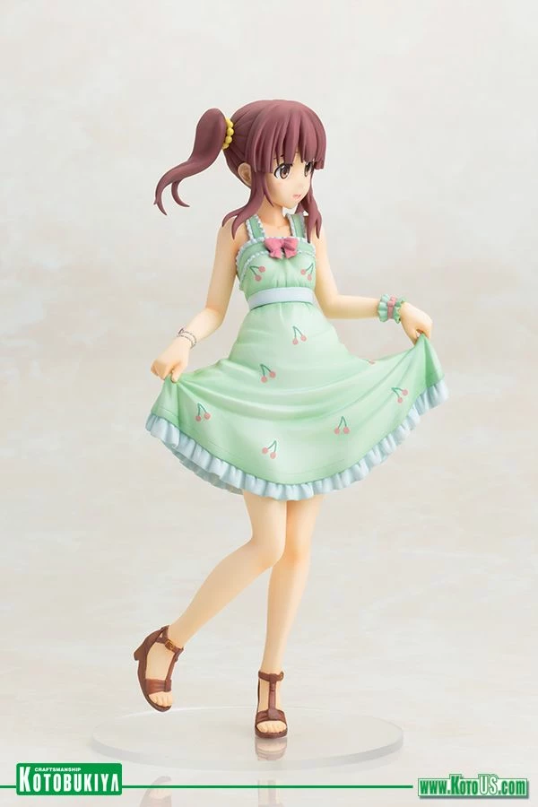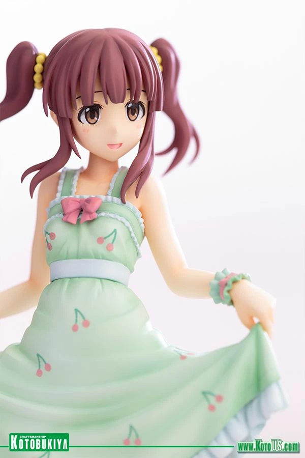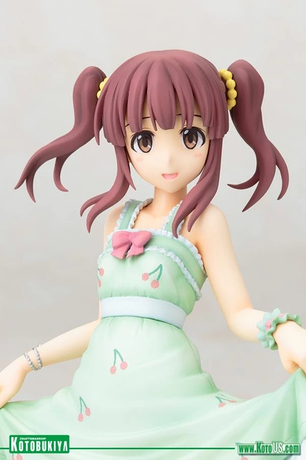 A KOTOBUKIYA Japanese import! The next adorable contestant to join the Ani*Statue line from the Japanese hit video game and anime series Idol M@ster, bringing the fast-paced and exciting world of managing pop idols to life, is the high-strung clover-collecting CHIERI OGATA! The beautiful Cinderella Girl is captured in mid-curtsy, showing her respect and appreciation for you. Chieri wears an adorable light green cherry-print dress accented with a fringed hem, pink bow, and matching bracelet; she further accessorizes with brown sandals and yellow hairbands holding up her pigtails to complete her look from the game. As with every Ani*Statue Ms. Ogata is incredibly detailed from the subtle elements of her clothing to the way her hair hangs around her cute smiling face.