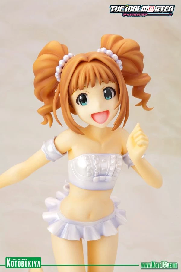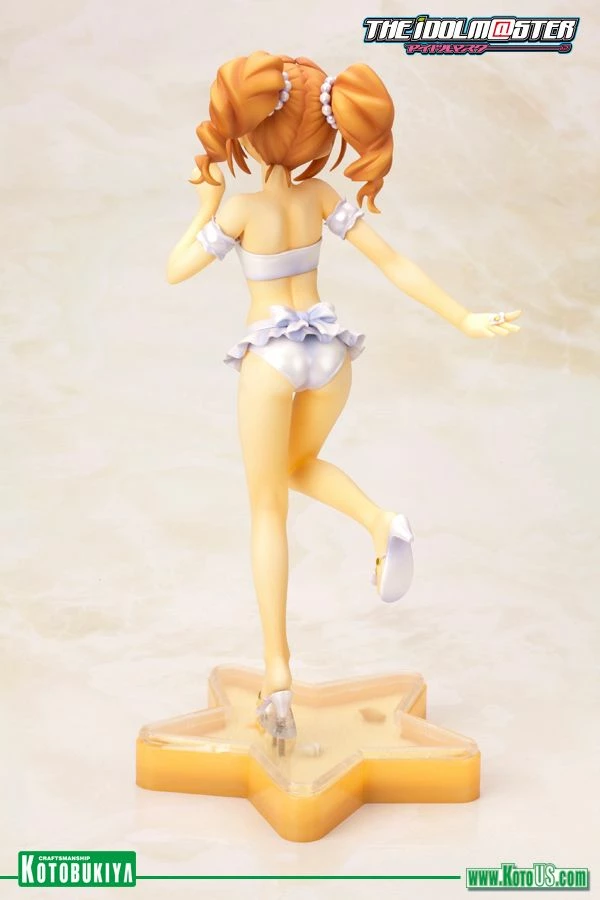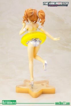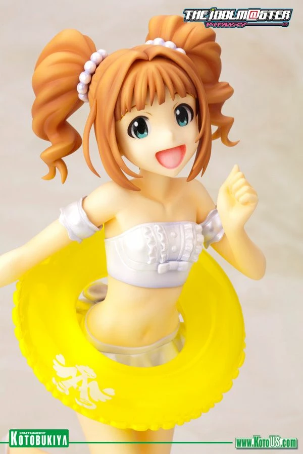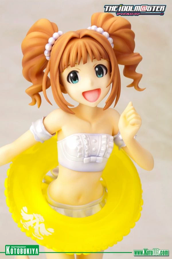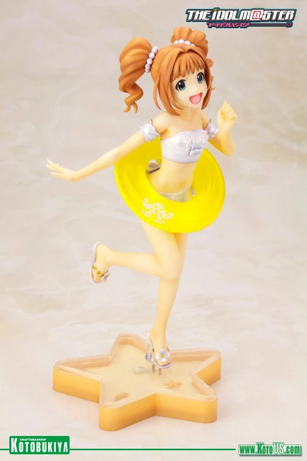 A KOTOBUKIYA Japanese import! The next adorable contestant to join the Ani*Statue line from the Japanese hit video game and anime series The Idolmaster (bringing the fast-paced and exciting world of managing pop idols to life) is the loud, hyperactive singer taking a break to enjoy the sunshine on the beach, YAYOI TAKATSUKI -ANGELIC ISLAND-! Captured mid-stride while running out onto the beach, Yayoi wears a fun frilled white bikini with matching arm bands and cute little shoes decorated with flowers and gold discs. With her youthful exuberance she skips ahead, balancing on one foot with the other leg bent at the knee and her arms in motion. Yayoi wears a huge, infectious grin and her green eyes sparkle beneath her brown hair held up in pig tails by pearl ties. You can even display the pretty singer with or without her bright yellow inner tube! Sculpted by Taketo Ogasawara, Yayoi stands 9 inches tall (1/7 scale) on a star-shaped beach-themed base similar to those of the other Idolmaster Ani*Statue girls!